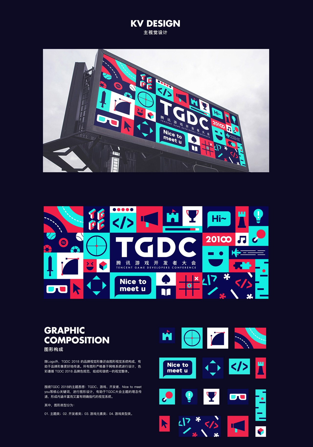 TGDC 2018 腾讯游戏开发者大会 5SD联合腾讯TGideas团队,共同刷新TGDC品牌标识和规范 TGDC的初衷是希望打造为国内游戏开发行业的一次交流大会,推动国内游戏研发行业发展。邀请的演讲嘉宾包括来自国内外的知名游戏制作人与设计者,覆盖产品策划、艺术设计、技术研发、市场等内容。 我们希望本次大会能够不同于以往腾讯互动娱乐的会场设计,采用的风格需要有包容性避免过于风格化,营造出TGDC大会的包容、交流、碰撞的感觉。 Client: 腾讯游戏学院 Date: 2018年8月 Services: 品牌包装、创意视觉